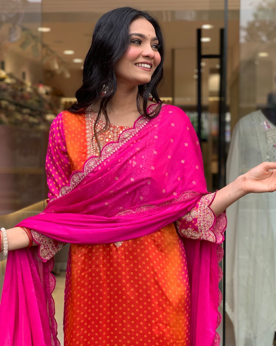 Make every moment shine with this Bandhani suit set crafted with luxurious golden thread embroidery. This 3-piece set with dupatta is designed for the modern woman who loves a classic yet trendy look — perfect for Navratri nights, weddings, or festive gatherings